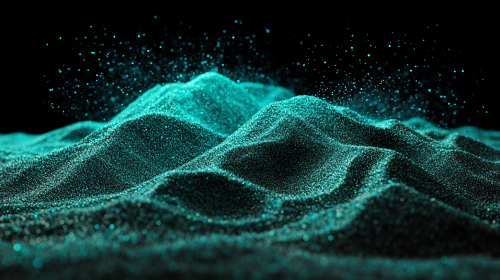 complex, random share 3D object,is filled with blue-green gradient sand! No floor, fully Dark black background. Photorealistic render, 4k --ar 16:9 --style raw