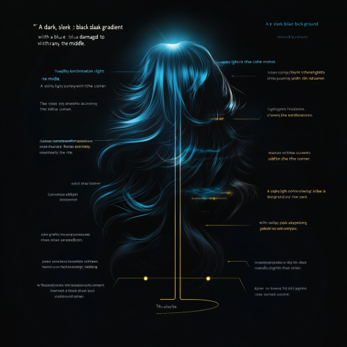 A sleek black background with a blue gradient shining from the center, illuminating vibrant, glowing hair strands. A shiny light source is placed in the middle, giving a futuristic feel. Add a small yellow detail in the corner, blending naturally with the black and blue colors