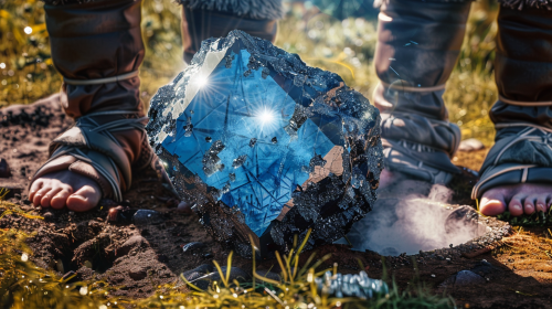 3 vikingsfeet ina semi circle, in front of them a heafty large blue diamond shaped stone with dark rock encrusted on it in spots, it is steaming, a dent is in the gorund, the camera is aimed at their feet that are wrapped in basic Viking shoes, and the stone is in the forground , it is bright like a saphire, shining, there is grass and dirt aound the stone and they are standing on the grass --no text --ar 16:9 --style raw --v 6.0