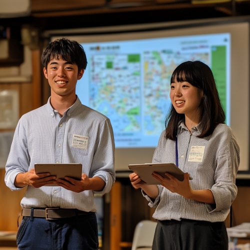 An indoor event focused on regional revitalization in Japan, where a young man and woman are giving a presentation to an audience. They are standing in front of a projector screen displaying information about local communities and relocation opportunities. Both presenters are holding tablets as they explain their points. The man is wearing a light, button-up shirt, and the woman is similarly dressed in a casual but professional manner. The setting is modern and welcoming, with charts and maps visible on the walls, and the atmosphere is friendly and collaborative