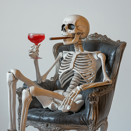 a close-up shot of a a realistic skeleton sitting in a fancy chair inspired by the jazz era, with a red cocktail in hand, cigar in mouth, legs crossed. white background