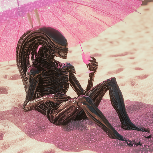 hyper realistic photograph Xenomorph sunbathing on a beach with pink glittery sand. it's a sunny day, he's sitting under a pink glittery parasol sipping on a cocktail.