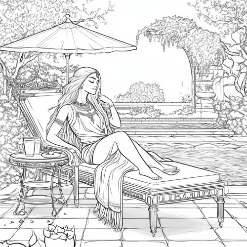 A coloring book page of an Indian woman with a long white hair, relaxing on a chaise lounge chair in the sun on a summer day, surrounded by a pool with water, and a umbrella table with a drink on it. She has both hands down to her sides, embodying calmness and relaxation. The background is simple to keep the focus on her figure, with subtle lines or patterns around her for coloring. This design captures self-care through relaxation techniques. Black line art, no shading, white background.