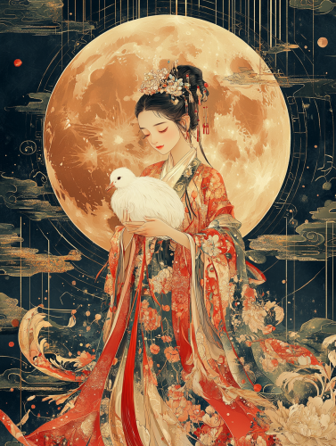 A vector illustration in Dunhuang style featuring the Moon Goddess Chang'e gracefully holding an adorable white BIRD, set against the backdrop of a giant, detailed moon. Traditional Chinese elements like floating clouds and intricate patterns surround the scene, enhancing the mystical atmosphere. The entire composition is rich in Chinese cultural motifs, capturing the essence of the Mid-Autumn Festival in a vibrant and elegant artwork. --ar 3:4 --style raw --stylize 750 --v 6.1
