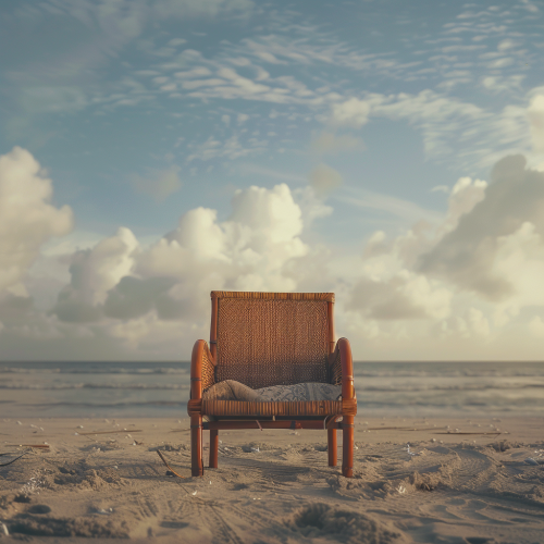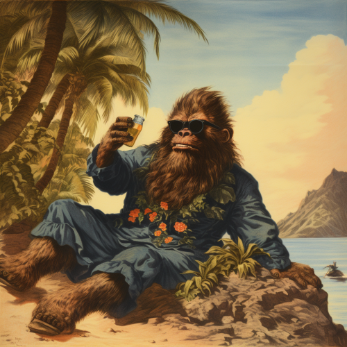 Vincenzo steht auf einem tropischen Strand, sein langer weißer Bart weht im Wind. In der einen Hand hält er einen Gehstab, während er in seiner anderen Hand ein buntes Getränk in einer Kokosnussschale hält. Im Hintergrund wogt das blaue Meer, und der Himmel ist strahlend blau. --v 6.1
