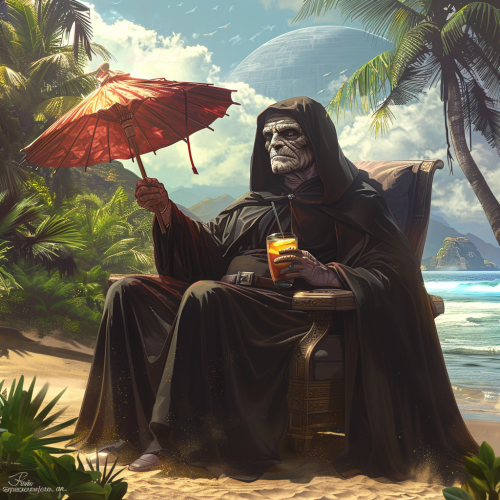 Emperor Palpatine relaxing on a tropical beach, sipping a fruity drink with a little umbrella --v 6.0