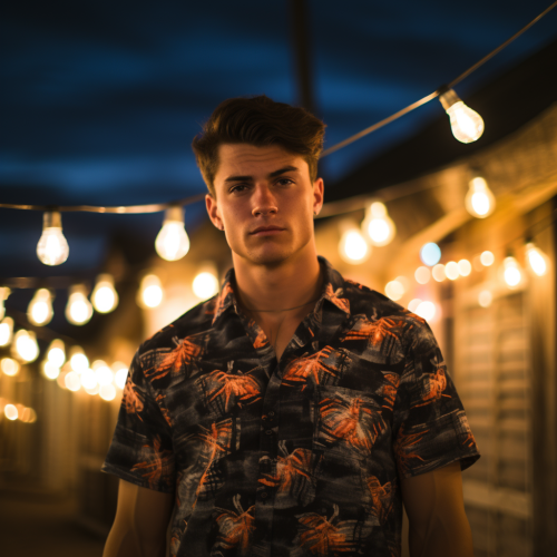 model wearing hawain shirt in a beach night vibe, luxury, bali type ,