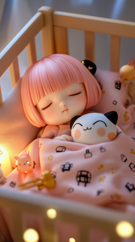 Baby Anya from Spy x Family in an ultra-cute chibi style, peacefully sleeping in a small wooden crib, wrapped in a soft pink blanket with elegant gold accents, matching her signature black and gold hair accessories. Her short pink hair frames her round face, and her large, curious eyes are gently closed. A plush of her beloved Chimera doll is tucked under one arm. The crib is surrounded by plush toys and small spy gadgets, adding to the cozy yet playful atmosphere, with pastel colors highlighting the scene. 8K, HDR, high quality, --ar 9:16