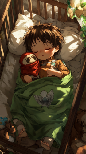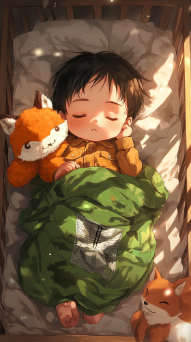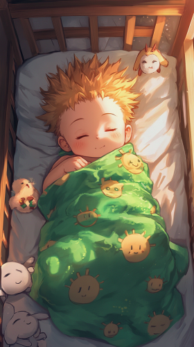Baby Deku from My Hero Academia in an ultra-cute 'uwu' style, peacefully sleeping in a small wooden crib, wrapped in a soft green blanket with tiny hero symbols. His chubby cheeks are blushing, and a gentle glow of hero power surrounds him like a protective aura. In his arms, he holds a small, red scarf plush toy, and nearby, a plush of Deku adds to the cozy scene. The crib is surrounded by plush toys shaped like hero gear and All Might's symbols, with pastel colors creating a warm, cozy atmosphere. 8K, HDR, high quality, --ar 9:16
