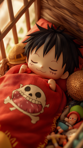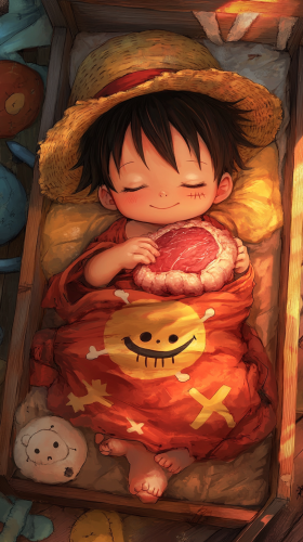 Baby Luffy in an ultra-cute 'uwu' style, peacefully sleeping in a small wooden crib, wrapped in a soft red blanket with tiny straw hat symbols. His chubby cheeks are blushing, and a gentle glow of haki surrounds him like a protective aura. In his arms, he holds a comically oversized piece of meat, and nearby, a plush of Luffy from One Piece adds to the cozy scene. The crib is surrounded by plush toys shaped like pirate tools, with pastel colors creating a warm, cozy atmosphere. 8K, HDR, high quality, --ar 9:16