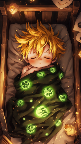 Baby Meliodas from Seven Deadly Sins in an ultra-cute chibi style, peacefully sleeping in a small wooden crib, wrapped in a soft green and black blanket with tiny sin symbols. His chubby cheeks are blushing, and his distinctive spiky blonde hair is styled adorably, with his characteristic little horns peeking through. A gentle glow of magical energy surrounds him like a protective aura. In the crib, he cuddles a plush version of his Demon Sword. The crib is surrounded by small plush toys shaped like magical items and symbols from the series, with pastel colors creating a warm, cozy atmosphere. 8K, HDR, high quality, --ar 9:16