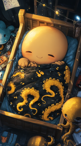 Baby Sukuna from Jujutsu Kaisen in an ultra-cute 'uwu' style, peacefully sleeping in a small wooden crib, wrapped in a soft dark purple blanket with tiny cursed energy symbols. His chubby cheeks are blushing, and a gentle glow of cursed energy surrounds him like a protective aura. In the crib, he cuddles a plush finger, reminiscent of his curse marks. The crib is surrounded by small plush toys shaped like Jujutsu Kaisen items, with pastel colors creating a warm, cozy atmosphere. 8K, HDR, high quality, --ar 9:16