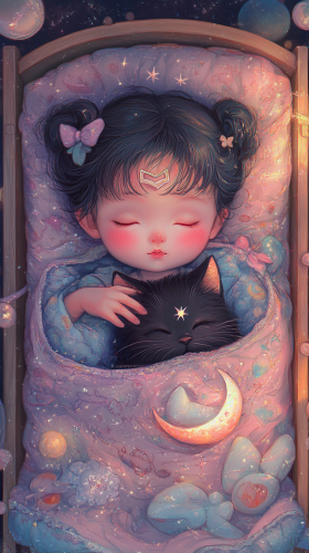 Baby Sailor Moon in an ultra-cute 'uwu' style, peacefully sleeping in a small wooden crib, wrapped in a soft pink and blue blanket with tiny crescent moon symbols. Her chubby cheeks are blushing, and a gentle glow of magical energy surrounds her like a protective aura. In the crib, she cuddles her cat Luna, who is black with a white star on her forehead, depicted as a plush toy. The crib is surrounded by small plush toys shaped like magical girl items, with pastel colors creating a warm, cozy atmosphere. 8K, HDR, high quality, --ar 9:16
