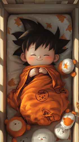 Baby Goku in an ultra-cute 'uwu' style, peacefully sleeping in a small wooden crib, wrapped in a soft orange blanket with tiny Dragon Ball symbols. His chubby cheeks are blushing, and a gentle glow of ki surrounds him like a protective aura. In his arms, he holds a small, red scarf plush toy, and nearby, a plush of Goku from Dragon Ball adds to the cozy scene. The crib is surrounded by plush toys shaped like Dragon Balls, with pastel colors creating a warm, cozy atmosphere. 8K, HDR, high quality, --ar 9:16