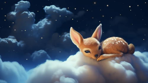A cute cartoon baby deer sleeping on clouds, with a starry sky background, in the style of Disney, high resolution, high definition, high quality, high detail, high contrast, bright colors, soft lighting, smooth and delicate fur texture, and a dreamy atmosphere. --ar 16:9 --v 5.2