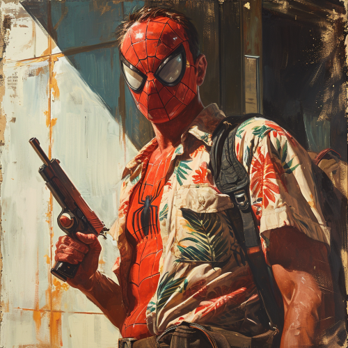 1980's pulp book cover art of a man wearing a cheap Spiderman mask, wearing a Hawaiian shirt, holding a gun, wearing a backpack, robbing a bank --s 250 --v 6.0