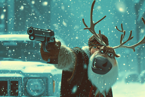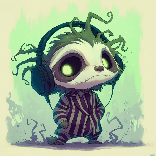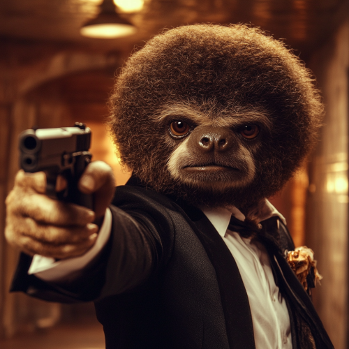 a sloth dressed as the character, Jules, in the movie pulp fiction played by Samuel L Jackson. In the scene where he delivers his bible verse where he's pointing a gun at the other man. he's wearing a black suit, white shirt and a black tie. He has a handle-bar mustache and a large afro