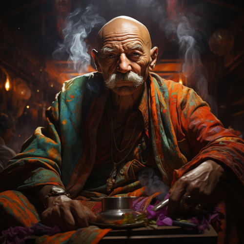 Photorealistic , Gandhi smoking in a club, swag, Pulp fiction movie style, vibrant and beautiful, intricate details, ultra realistic portrait --v 5.2 --s 750