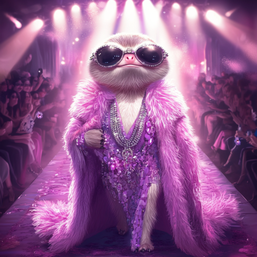 Create a luxurious and glamorous portrait of Sassy Sloth shutting down the runway at a high-fashion show. The scene should evoke the opulence and style of an SATC movie. Sassy Sloth is dressed to the nines in couture, confidently strutting down the runway with fashion show lighting, lots of camera flashes, and a cinematic feel. The runway is surrounded by bright lights, a captivated audience, and flashes from cameras, highlighting her as the star of the show. The overall aesthetic should be sophisticated, chic, and dripping with luxury, showcasing Sassy Sloth as the epitome of style and grace.