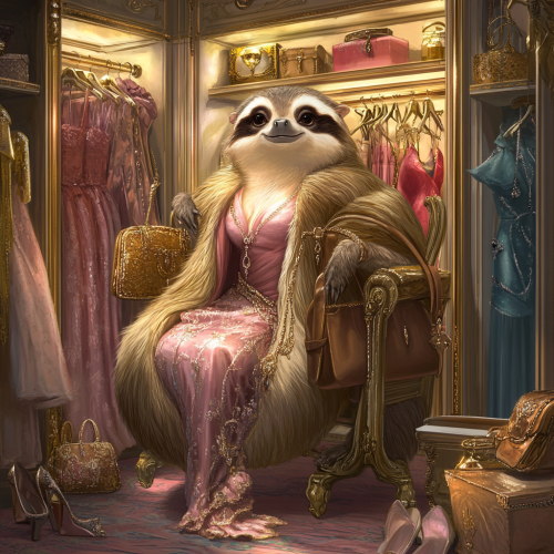 Create a luxurious and glamorous portrait of Sassy Sloth in a massive walk-in closet filled with high-end luxury gowns, clothing, and accessories. The scene should evoke the opulence and style of an SATC movie. Sassy Sloth is dressed to the nines in couture, striking a confident and fashionable pose. The closet is adorned with designer shoes, handbags, and jewelry, with everything arranged elegantly. The overall aesthetic should be sophisticated, chic, and dripping with luxury, showcasing Sassy Sloth as the epitome of style and grace.