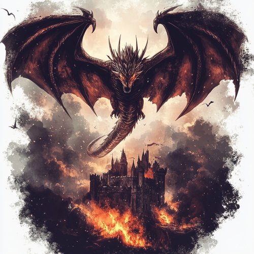 Highly detailed illustration of a fierce dragon with outstretched wings flying above a medieval castle, fire and smoke emanating from the ground below. The dragon should have sharp features and dynamic lighting, with glowing accents on the wings and eyes. Design the image with a transparent background and without any text, optimized for clipart-style T-shirt print --v 6.1