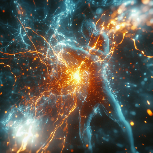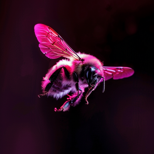 a glowing bumble bee fluorescent pink, flying through the air, dark background, dramatic lighting