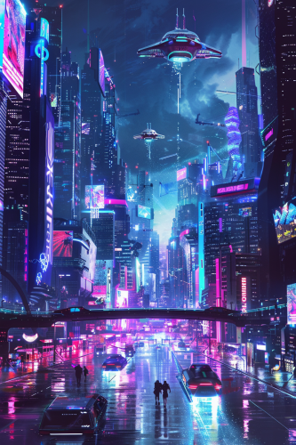 Futuristic city at night: A vibrant cityscape with towering skyscrapers glowing with neon lights. Flying cars zip through the sky as people walk across floating bridges. The streets are alive with holographic advertisements, and the skyline is a blend of sleek, metallic architecture and glowing, colorful lights. --v 6.0 --ar 2:3