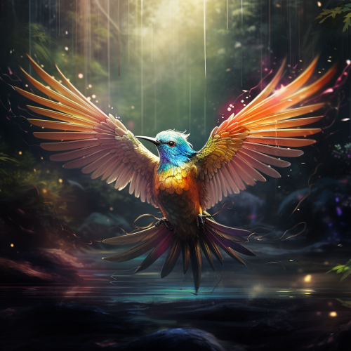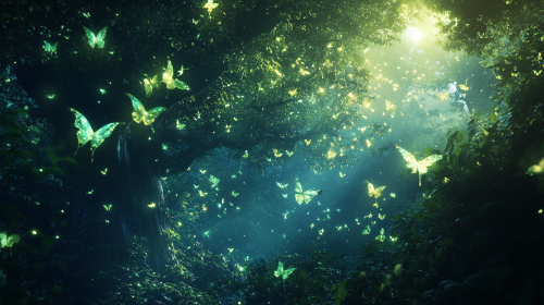 A swarm of glowing faerie insects flying through a magical forest, in the style of fantasy realism, soft ethereal light, vibrant blues and greens, delicate and whimsical atmosphere --ar 16:9