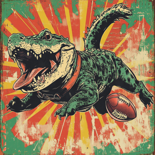 A vibrant, full-color poster of an alligator eating a bulldog in motion, flying through the air as if worn by someone jumping. The denim should be richly textured, Bold typography overlays the image, capturing the essence of rebellion and freedom associated with American football a symbol of rugged individualism and youth culture. Art Style: Pop Art, Urban, Grunge