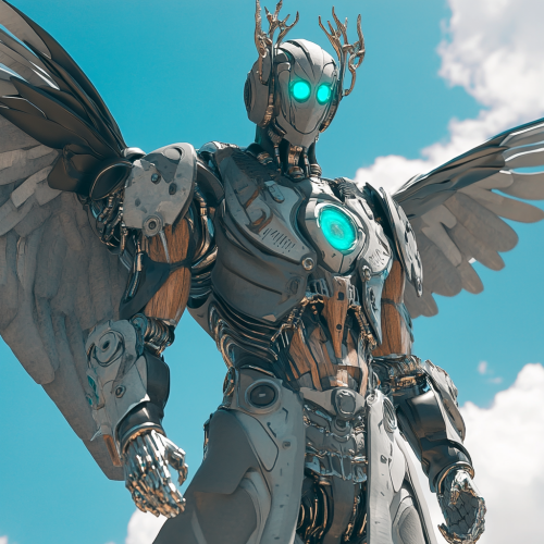 realistic full body image of a robotic warforged male Angel with glowing teal eyes, metal plates and wooden body parts, a metal robotic crown, and hes wearing fantasy grey and teal Angel clothing with robotic details. The background is the the sky. He is flying