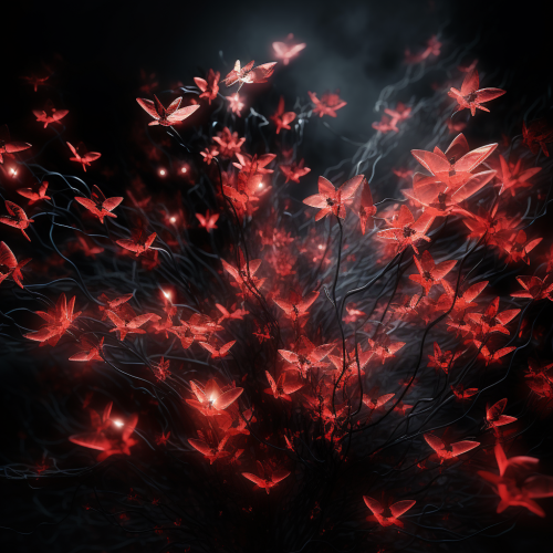 many small glowing spirit blossom flying away in the air , color red, fantasy, black background