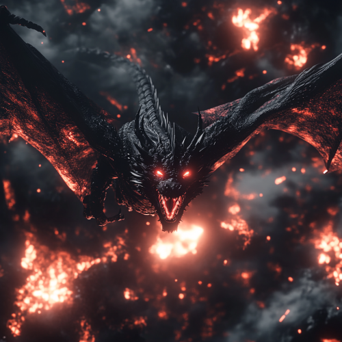 red eyes black dragon in the style of Kentaro Miura, black and white, berserk manga, 3d blender rendering, 4k, awesome background, full body shown, realism, manga, glowing fire, flying in the air, symetrical