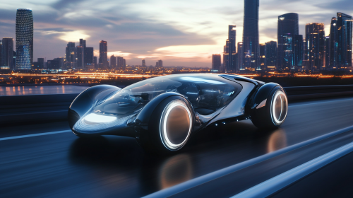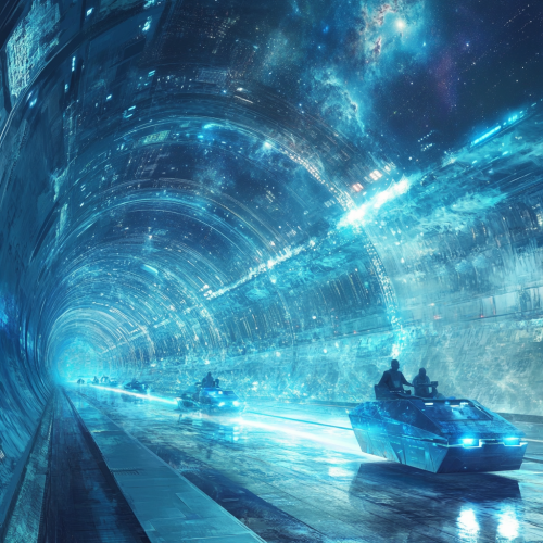 A huge tunnel-shaped passageway is made up of only airflow, directly connecting Earth and other planets. There is no physical structure or support inside the passage, which is maintained only by the difference in air movement and pressure. Tunnels have a translucent blue color and have fluid-like visual texture. People ride futuristic, smooth, cube-shaped vehicles, travel smoothly and quickly with the flow of air, leaving an afterimage of the air on their path. Outside the passage, a view of the galaxy and other planets is spread out, and inside the tunnel, the external view is clearly visible without glass.
