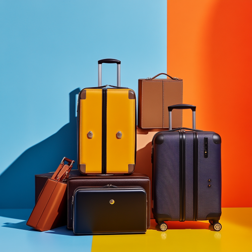 Luxurious travel gear collection with high-end suitcases & sleek business bags, on a vivid, colorful backdrop, featuring elegant business travelers. --fast