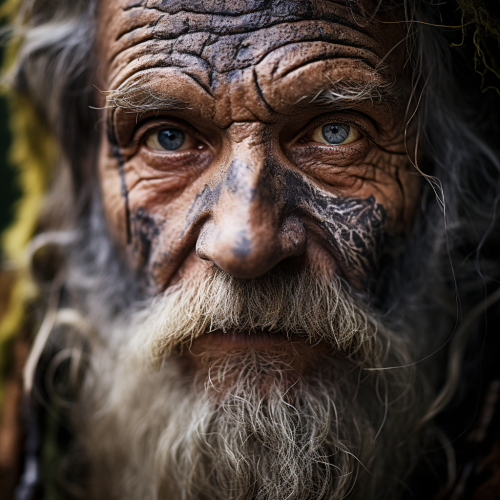 Create a highly detailed, close-up image focusing on the face of an elder druid aged around 50-60 years. His weathered skin carries the lines of countless battles, and his piercing eyes reflect unwavering determination and wisdom. Silver strands of hair frame his stern face, intertwined with small braids adorned with leaves and natural beads. A soft, warm-yellow mystical light illuminates his strong features, emphasizing his resolute expression as he confronts a formidable evil looming just beyond the frame. The background is subtly darkened to highlight the druid's face, capturing the intensity of the moment and his indomitable spirit. --v 5.2