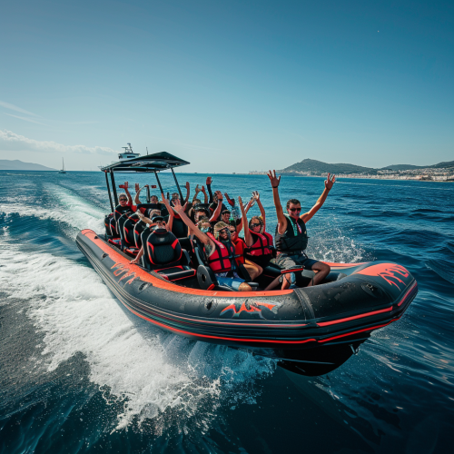 adrenaline fast Black and Red Rigid Inflatable Boat 8 meters in length with 12 jockey seats in row in pairs of 2 in the mid-front section of the boat, turning to the right, a big outboard engine, a captain in the stern, with a small tip top sun cover in the stern, happy people seated with one hand in the air, sunny sky, blue water, Palma de Mallorca bay in the background, viewed from outside side front, drone view, water splashing, realistic, high quality