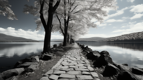 Cobblestone path around mountain lake. Abstract cubist. Asheville North Carolina. Extreme blue skies. Fall. Autumn. Peak leaves. High-end. Stylish. Important. Mysterious. Black and white with vibrant color splash. Shot with a Pentax. K-3 III Monochrome. --ar 16:9 --q 0.5 --s 750