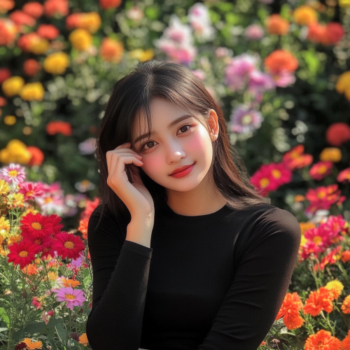 Korean drama poster, a cute young Indonesian girl wearing tight black longsleve shirt looking to the side and smiling, pretty eye smile, looking shy, the hand covering some parts of the face, super shy, The background is colorful flowers. photo, looks real, hyperreal, instagram profile picture taken by amateur camera, suitable for social media, hyperreal, in the style of instagram profile picture taken by iphone, suitable for social media, --v 6.1