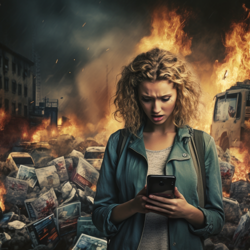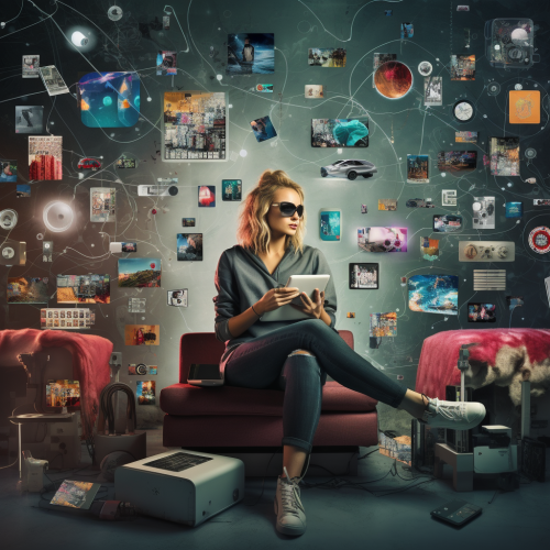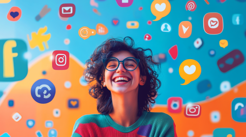 A dynamic, eye-catching image of someone managing social media with a confident smile, surrounded by vibrant graphics and social media icons --ar 16:9