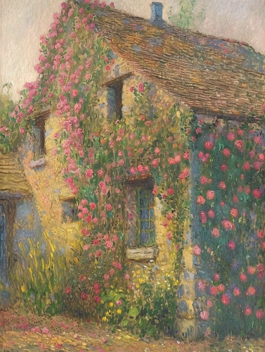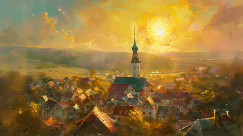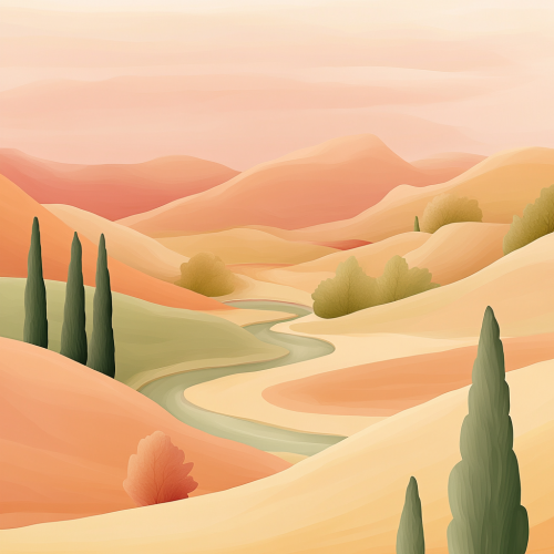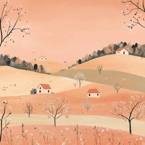 Soft, rolling countryside landscape with quaint houses in pastels.