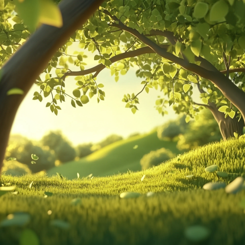 A serene, peaceful landscape with gentle green hues, rolling grassy hills, and softly swaying trees. Golden sunlight filters through the leaves, casting a warm glow. The scene is tranquil and calming, with soft colors and Pixar-inspired 3D animation style, evoking a sense of relaxation and peace