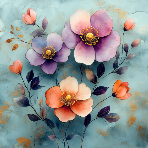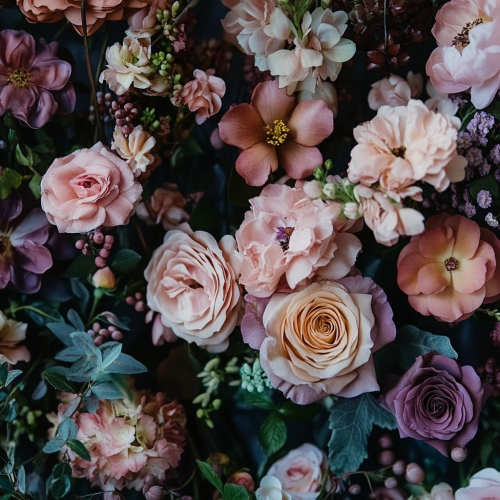 a pattern, lush, ornate floral patterns with roses, peonies, or tea blossoms, leaning into a color palette that blends soft pastels with bold, deep tones (like dusty pinks, muted blues, sage greens, and rich burgundy)