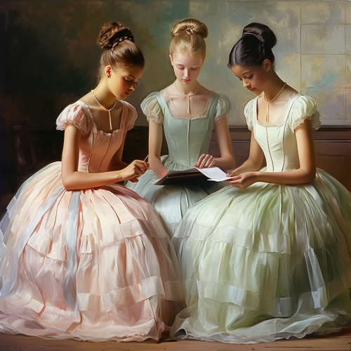 3 ballerinas age 14 dressed in full white and soft pastels tutus skirts and flat ballerina slippers. each doing a different dance movement. Natural hair and features. Painted in the oil painting style of Degas, inside a large old fashioned natural light dance studio. High quality. Soft pastels. Realistic fingers and feet. graceful movements - --s 750