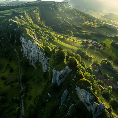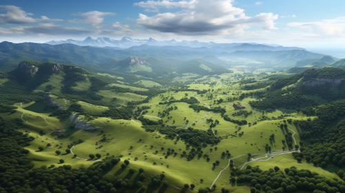 realisitc aerial view of central europe hilly countryside, carpathian hills, rolling hills, remote landscape, sharp, isometric view, --ar 16:9