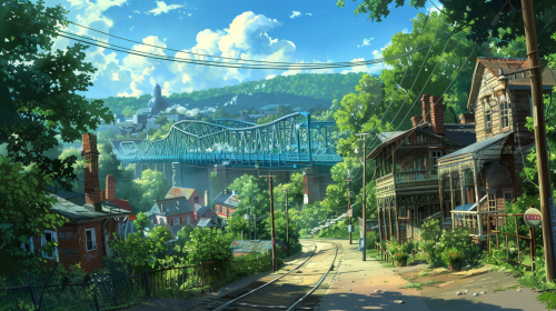 A small kentucky town with a large blue bridge in the distance, style of studio ghibli, --ar 16:9