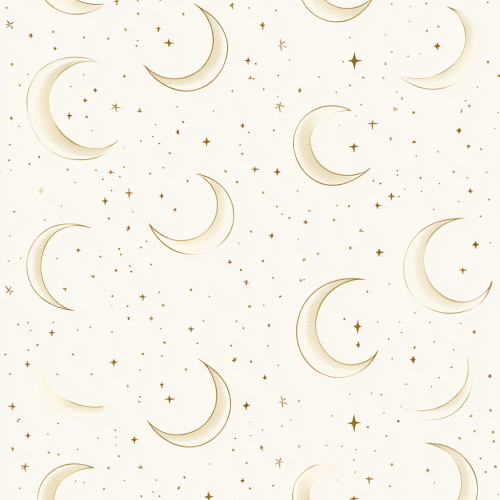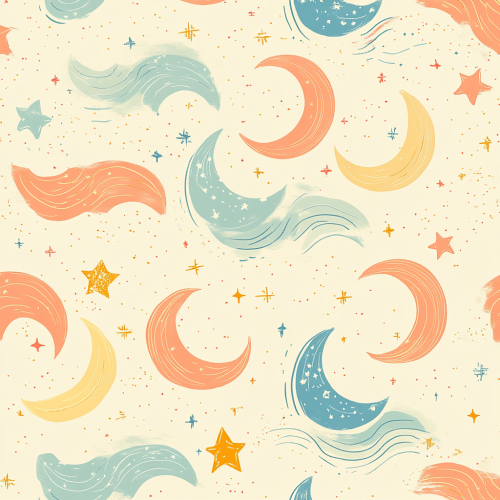 A bright and vibrant pattern featuring crescent moons and stars, inspired by traditional Korean hanbok designs and folk art. The moons should resemble the soft, flowing curves of hanbok sleeves, and the stars should take the form of subtle knots and traditional Korean symbols of good fortune. Incorporate playful and fluid lines, with bright pastel shades of peach, sky blue, and light gold. The design should evoke the feeling of a peaceful evening in a traditional Korean village, with a modern, whimsical twist, celebrating both serenity and joy.