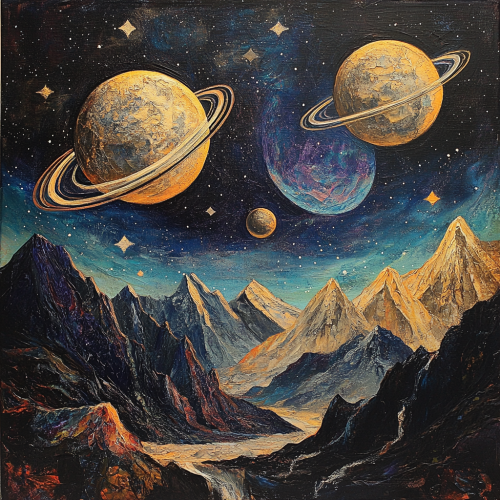 night sky with two moons. one silver, one gold. nine shimmering planetary rings, above majestic mountains, with scattered stars twinkling, ultra-detailed, depicting a captivating celestial landscape, mysterious and enchanting, vivid colors, highlighting contrasts of light and darkness.