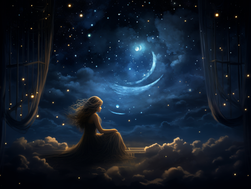 Beautiful night sky with stars and clouds, a blue lace border, white roses in the corners, a crescent moon, in the style of digital art, detailed, hyper-realistic, with black, gold, and silver metallic colors, beautiful, elegant, fantastical, intricate details, high resolution, high definition. --ar 3:2