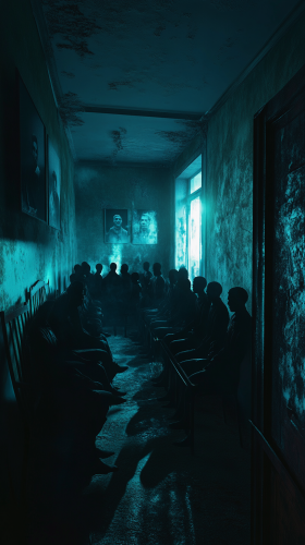 A haunting image of a darkened Soviet-era room filled with shadowy figures clapping endlessly, symbolizing the oppressive control of Stalin’s regime, surreal, hyper-realistic, Ultra HD --ar 9:16