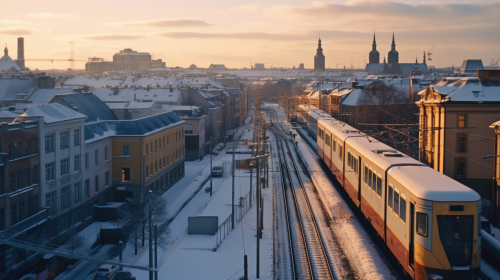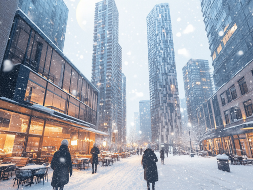 Stock minimalist photography of a bustling modern metropolis during heavy snowfall. Tall skyscrapers are cloaked in snowflakes, while people walk bundled up in thick coats and scarves. no people in the streets. Streets are covered with snow and ice, and city lights reflect off the falling snow. Add cozy street cafés with snowy outdoor seating, and a few visitors sipping hot drinks. The soft glow of the moon peers through snowy clouds, in the style of tourism photography --ar 4:3 --no people --style raw --stylize 60 --v 6.1